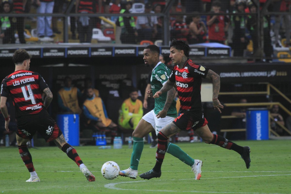 Futbol, Palmeiras vs Flamengo. Final de Copa Libertadores 2025. El jugador de Palmeiras Allan, centro, disputa el balon con Erick Pulgar de Flamengo durante el partido Final de la Copa Libertadores 2025 en el Estadio Monumental de Lima , - DiaEsportivo/Photosport