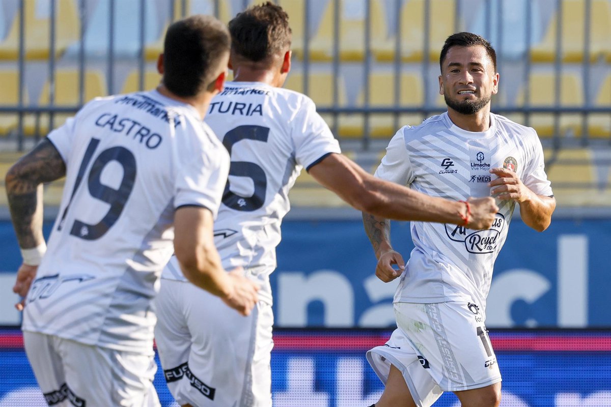 Futbol, Coquimbo Unido vs Deportes Limache. Semifinal Supercopa 2026. El jugador de Deportes Limache Jean Meneses, derecha, celebra con sus companeros tras marcar un gol contra Coquimbo Unido durante la semifinal de la Supercopa disputada en el estadio - ANDRES PINA/PHOTOSPORT