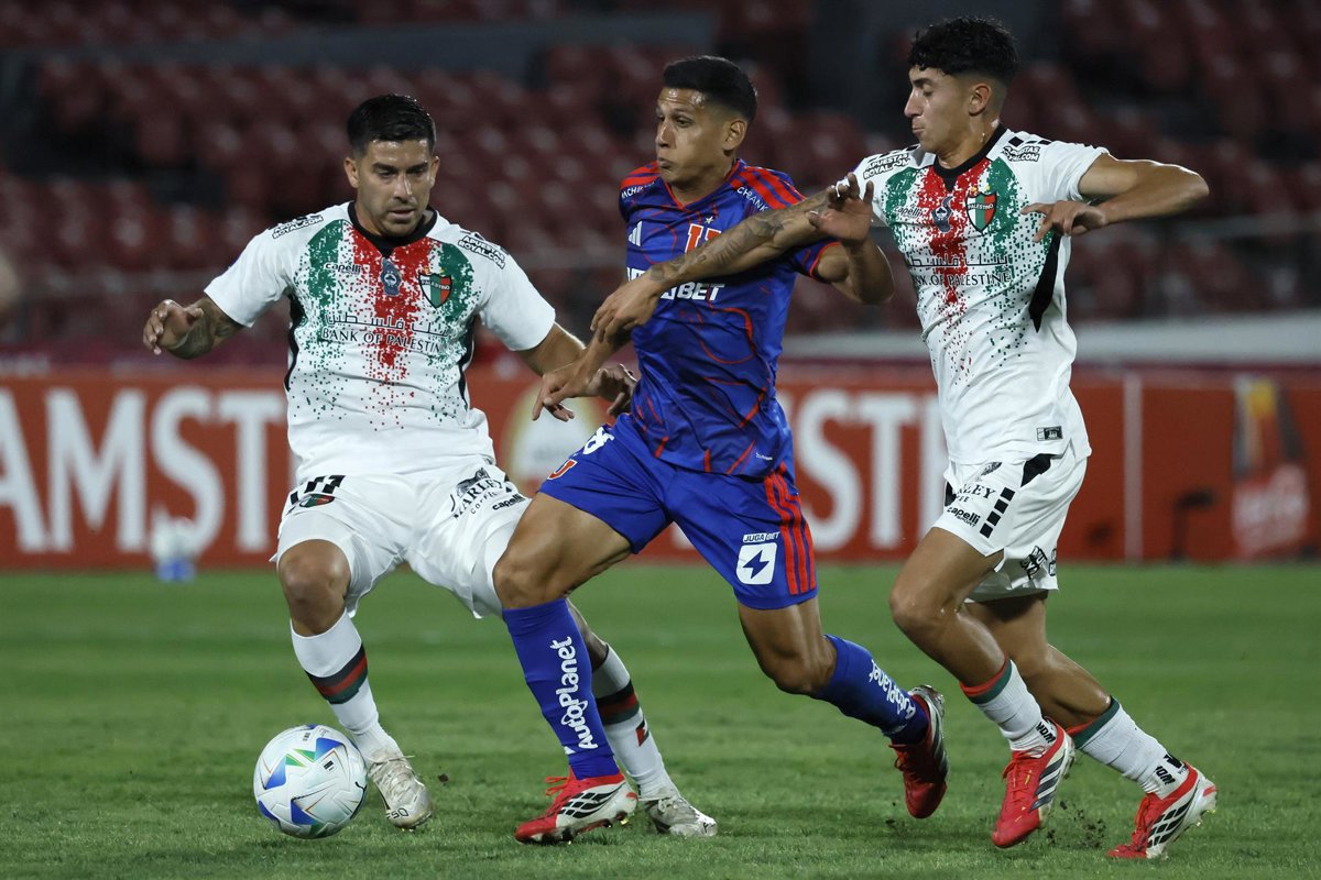 Futbol, Universidad de Chile vs Palestino. Primera fase, Copa Sudamericana 2026. El jugador de Universidad de Chile Israel Poblete, centro, disputa el balon con la defensa de Palestino durante el partido de primera fase de la Copa Sudamericana realizado - ANDRES PINA/PHOTOSPORT