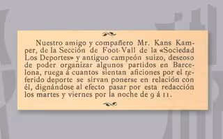 De ahí que pidiera ayuda en el gimnasio rival, el Gimnasio Solé, propiedad de un Francesc Solé que sí creyó en su idea y le ayudó en forma de publicar el siguiente anuncio en 'Los Deportes': "Nuestro amigo y compañero Mr. Kans Kamper, de la Sección de Foot-Vall de la 'Sociedad Los Deportes' y antiguo campeón suizo, deseoso de poder organizar algunos partidos en Barcelona, ruega a cuantos sientan aficiones por el referido deporte se sirvan ponerse en relación con él, dignándose al efecto pasar por esta redacción los martes y viernes por la noche de 9 a 11".